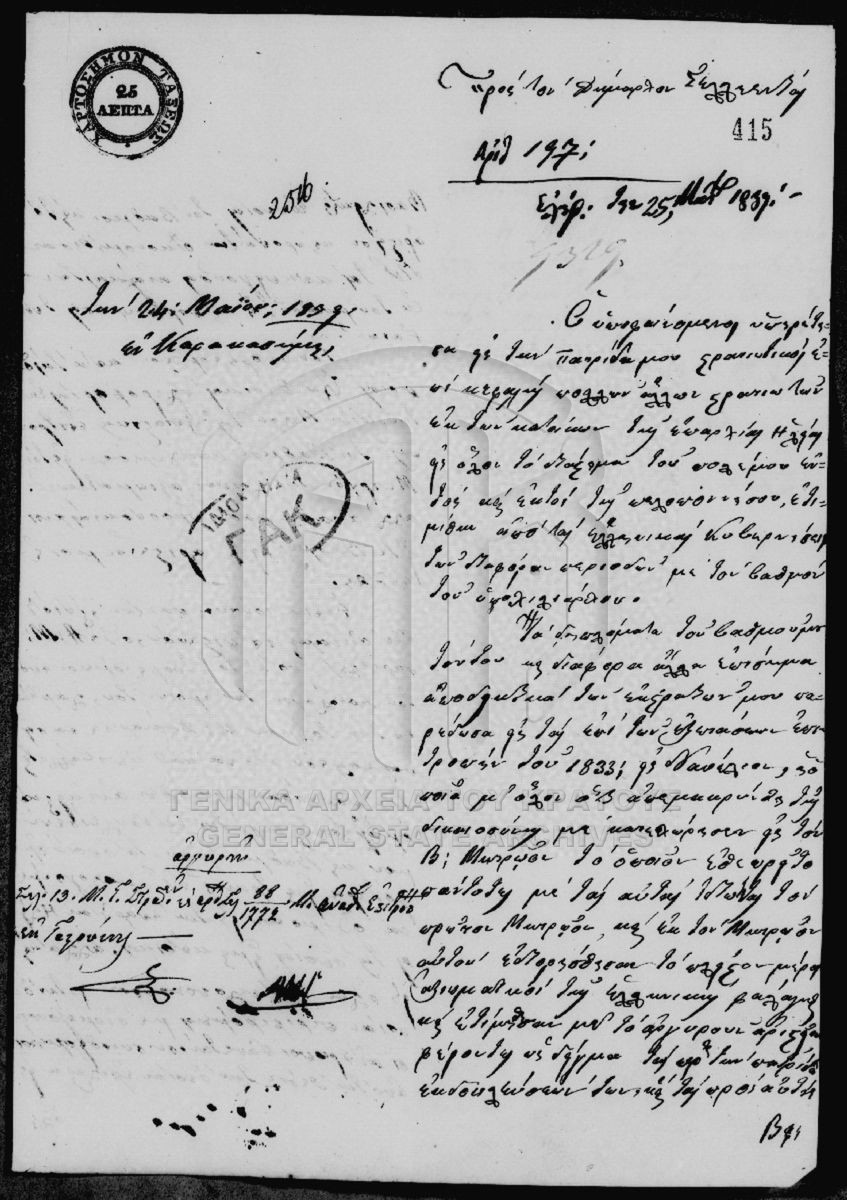 [Item] GRGSA-CSA_PAO007.00.01.F000023.IT000415 Item #415 - Aτομική αίτηση απονομής [24 Μαΐου 1839] Αίτηση του Νικόλαου Μπαλάσκα προς τον Δήμαρχο Σελληεντίας, προκειμένου να του απονεμηθεί αριστείο για τη συμμετοχή του στον Αγώνα υπέρ τη... |