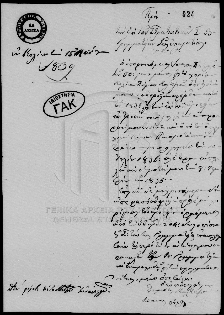 [Item] GRGSA-CSA_PAO007.00.01.F000025.IT000024 Item #024 - Aτομική αίτηση απονομής [15 Μαΐου 1839] Αίτηση του Ιωάννη Πούλου, κατοίκου του χωριού Κολλίναι, του δήμου Καλτεζών, προς την επί των Στρατιωτικών Β. Γραμματεία της Επικρατείας, ... |