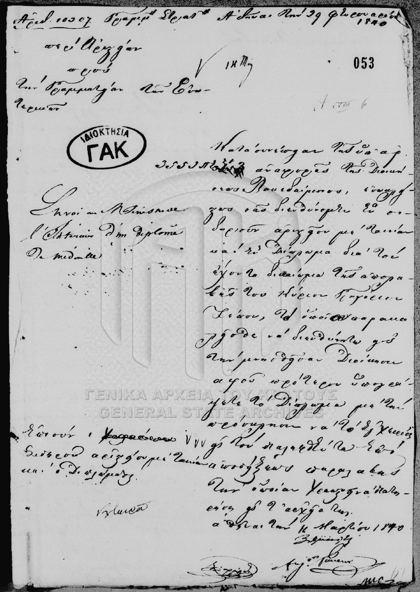 [Pièce] GRGSA-CSA_PAO007.00.01.F000025.IT000053 Pièce #053 - Υπηρεσιακή αλληλογραφία [11 Μαρτίου 1840] Η Γραμματεία των Στρατιωτικών διαβιβάζει προς τη Γραμματεία των Εσωτερικών ένα σιδερένιο αριστείο συνοδευόμενο από την ταινία και το δίπλ... |