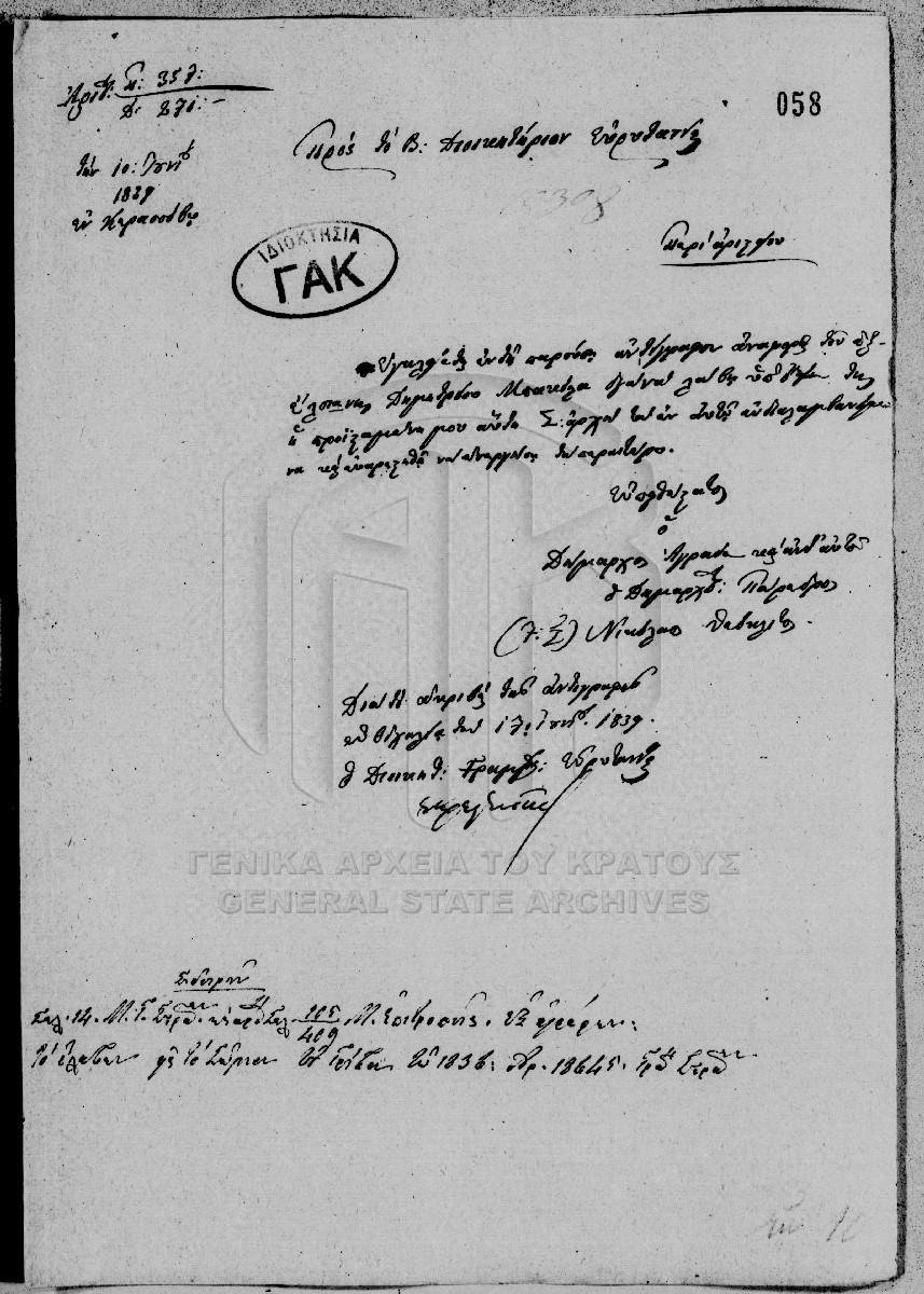 [Item] GRGSA-CSA_PAO007.00.01.F000025.IT000058 Item #058 - Υπηρεσιακή αλληλογραφία [10 Ιουνίου 1839] Αντίγραφο αναφοράς του Δημάρχου Αγραίων με την οποία διαβιβάζεται προς το Β. Διοικητήριο Ευρυτανίας η αίτηση απονομής αριστείου του κ. Δη... |