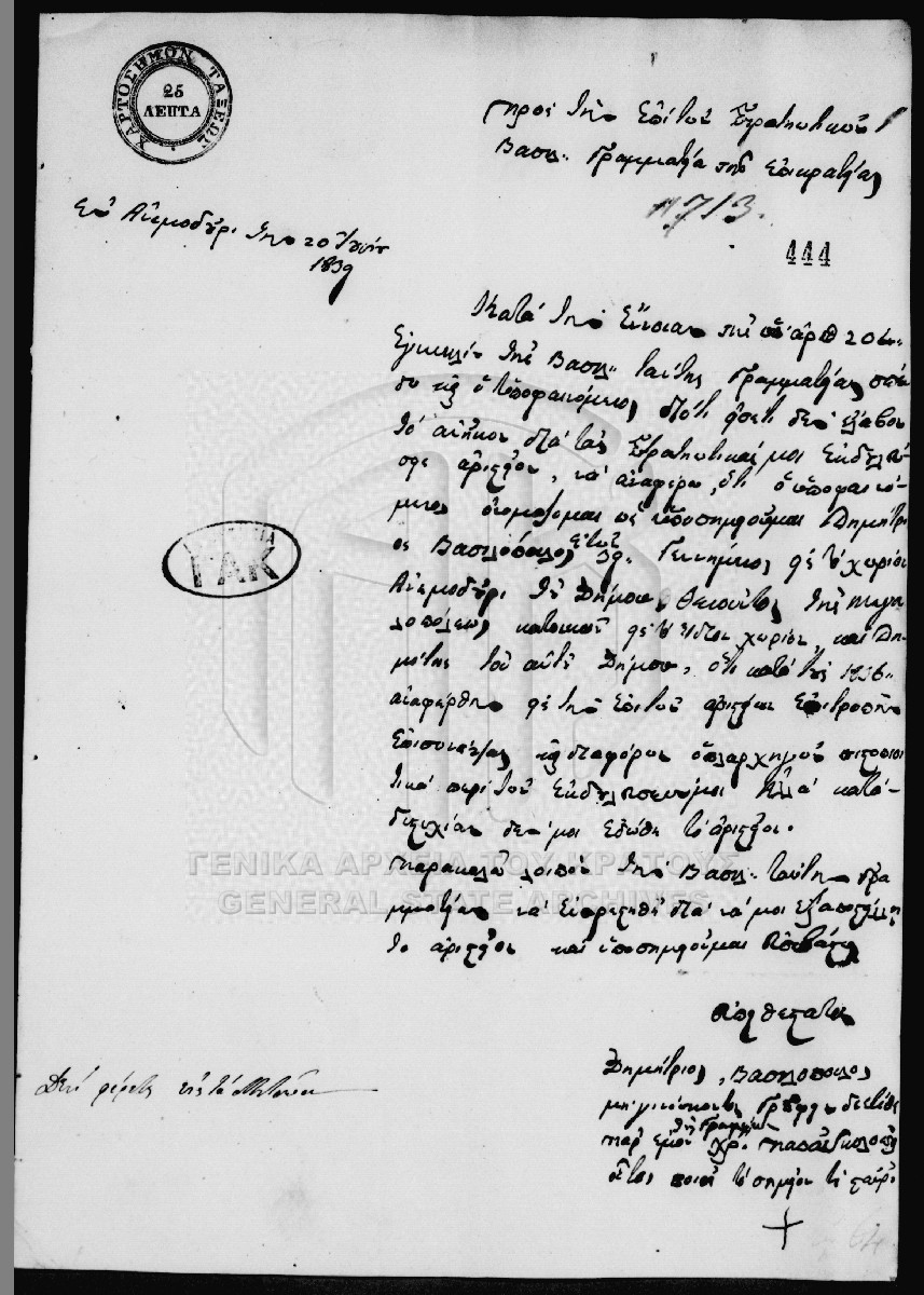 [Pièce] GRGSA-CSA_PAO007.00.01.F000027.IT000444 Pièce #444 - Aτομική αίτηση απονομής [20 Ιουνίου 1839] Αίτηση του Δημητρίου Βασιλόπουλου προς την επί των Στρατιωτικών Γραμματεία της Επικρατείας προκειμένου να του απονεμηθεί αριστείο. |