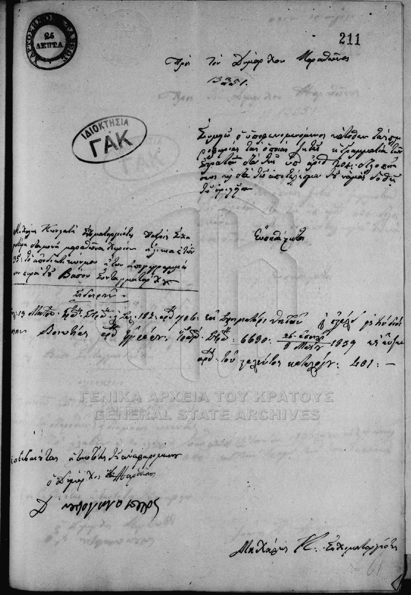 |  | [Item] GRGSA-CSA_PAO007.00.01.F000031.IT000211 Item #211 - Aτομική αίτηση απονομής [26 Απριλίου/8 Μαΐου 1839 ] Αίτηση του Μιχάλη Κ. Σχηματαργιώτη προς τον δήμαρχο Μαραθώνος, για να διευθύνει την αναφορά του για χορήγηση αριστείου προς την αρμόδια α... |