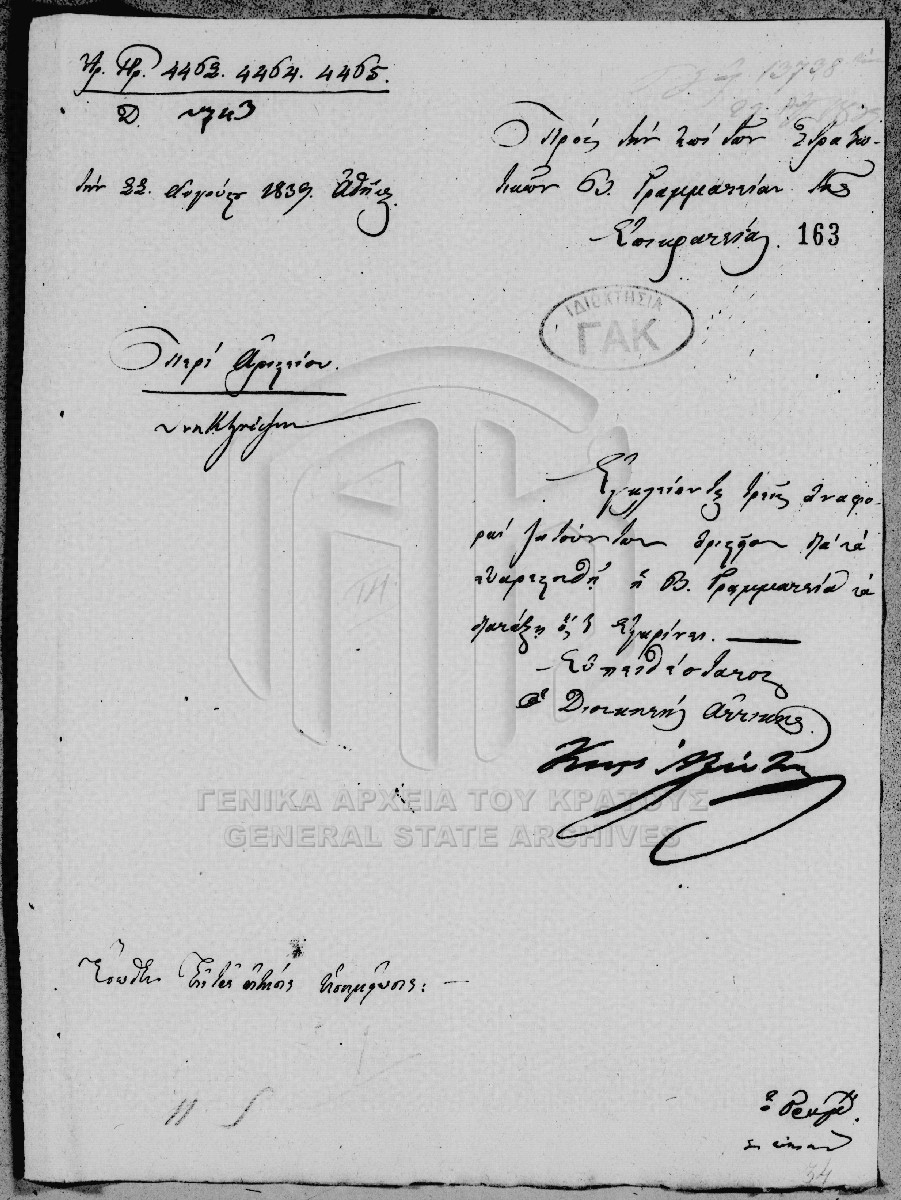 [Τεκμήριο] GRGSA-CSA_PAO007.00.01.F000032.IT000163 Τεκμήριο #163 - Υπηρεσιακή αλληλογραφία [22 Αυγούστου 1839] Επιστολή του διοικητή Αττικής προς την επί των Στρατιωτικών Γραμματεία της Επικρατείας,με την οποία στέλνει 3 αναφορές δημοτών που ζητούν... |