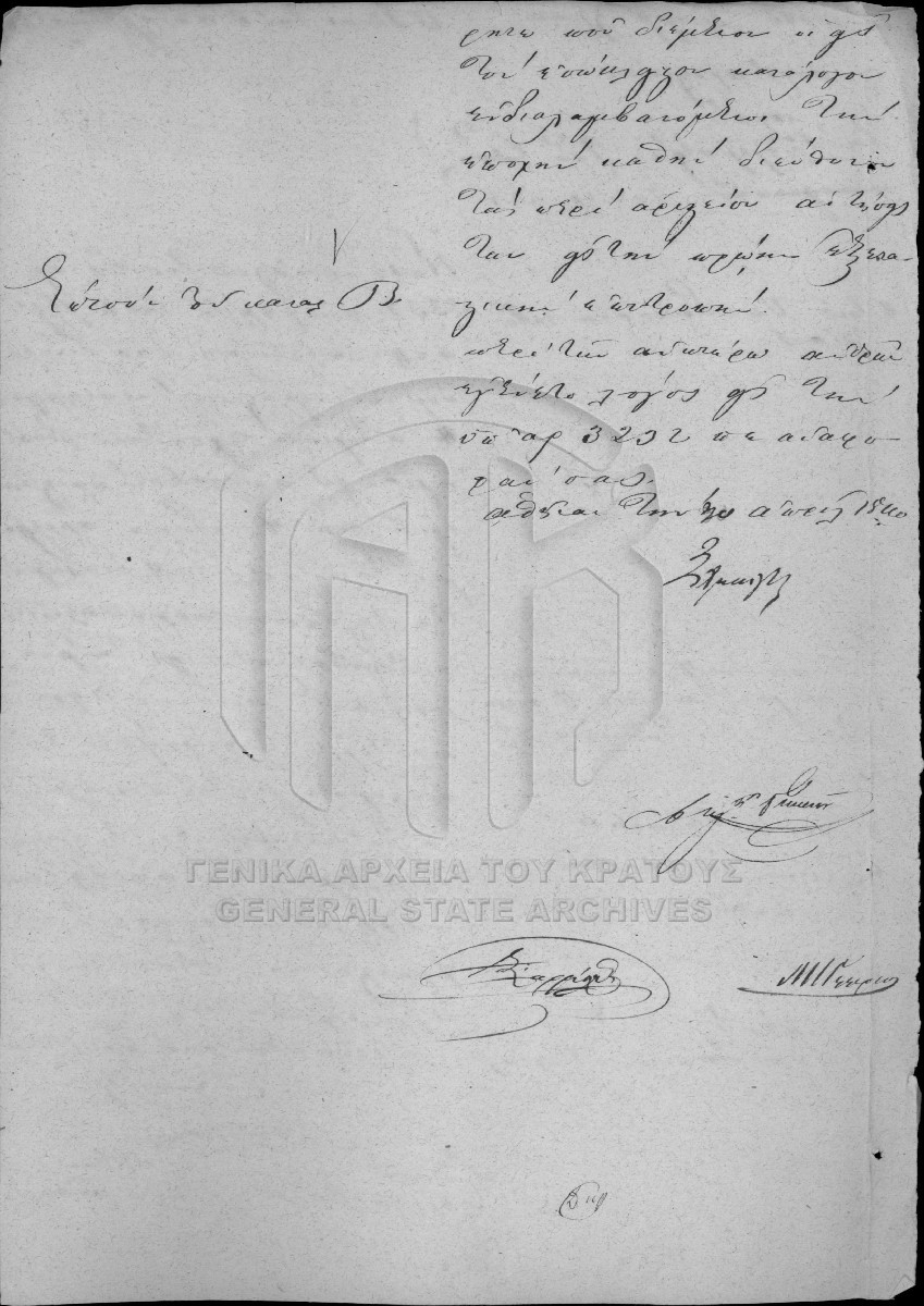 [Pièce] GRGSA-CSA_PAO007.00.01.F000035.IT000162 Pièce #162 - Υπηρεσιακή αλληλογραφία [20 Απριλίου 1840] Υπηρεσιακή αλληλογραφία προς τη Γραμματεία των Εσωτερικών για απονομή αριστείων. |