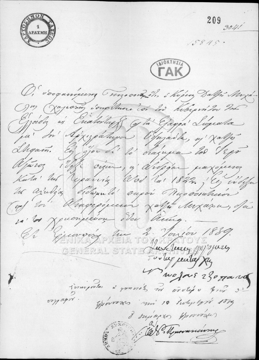 Πιστοποιητικό στο οποίο αποδεικνύεται ότι ο Χατζή Μιχαήλ Χαλεπλής υπηρέτησε στον Αγώνα υπέρ της Ανεξαρτησίας.