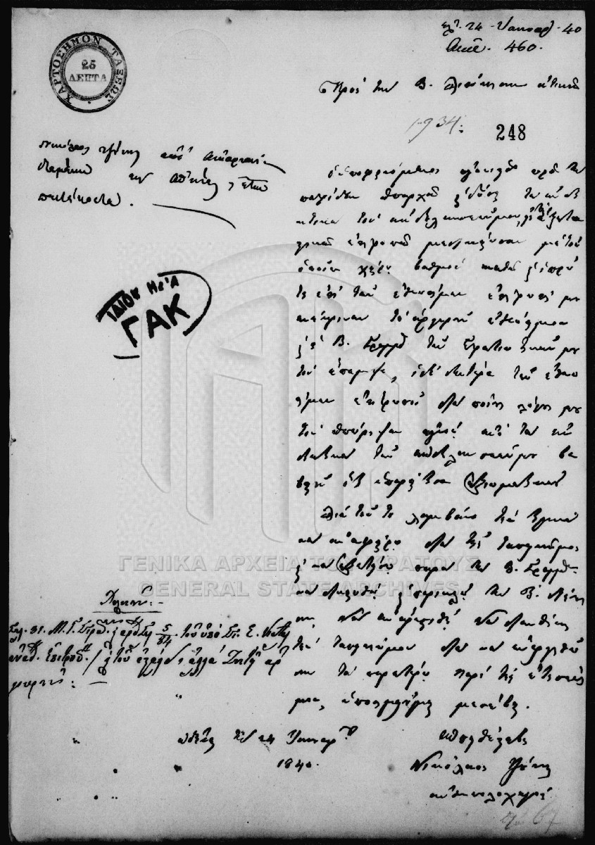 [Item] GRGSA-CSA_PAO007.00.01.F000047.IT000248 Item #248 - Aτομική αίτηση απονομής [24 Ιανουαρίου 1840] Αίτηση απονομής αργυρού αριστείου του Νικόλαου Τζούνη, ο οποίος απευθύνεται στη Διοίκηση Αττικής για να μεσολαβήσει και να διευθετήσει πε... |