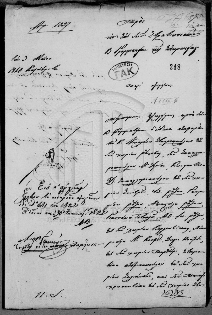[Τεκμήριο] GRGSA-CSA_PAO007.00.01.F000050.IT000248 Τεκμήριο #248 - Υπηρεσιακή αλληλογραφία [3 Μαΐου 1840] Επιστολή του γραμματέα της διοίκησης Κυναίθης προς την επί των Στρατιωτικών Β. Γραμματεία της Επικρατείας, με την οποία αποστέλλει δώδεκα... |