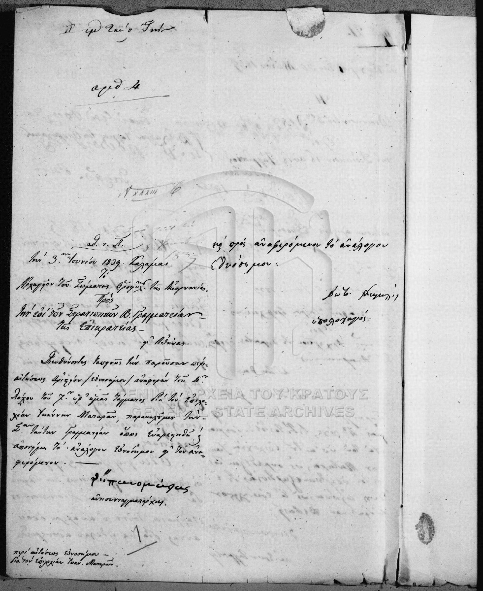 [Τεκμήριο] GRGSA-CSA_PAO007.00.01.F000053.IT000013 Τεκμήριο #013 - Υπηρεσιακή αλληλογραφία [30 Μαΐου 1839] Διαβιβαστικό αίτησης απονομής Εθνόσημου στον επιλοχία Ιωάννη Ματαρά. |