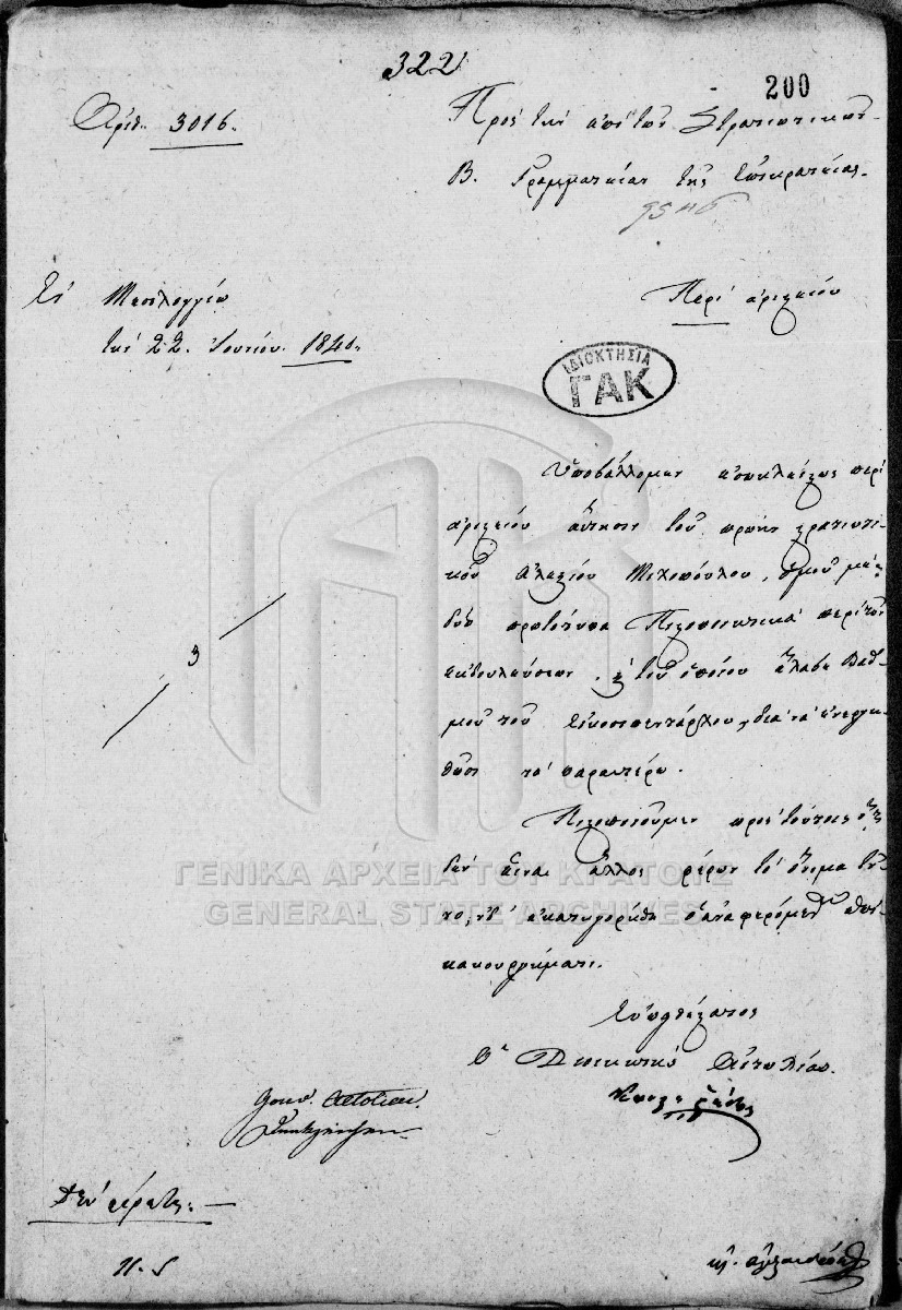 Τεκμήριο #200 - Υπηρεσιακή αλληλογραφία  [22 Ιουνίου 1840]
