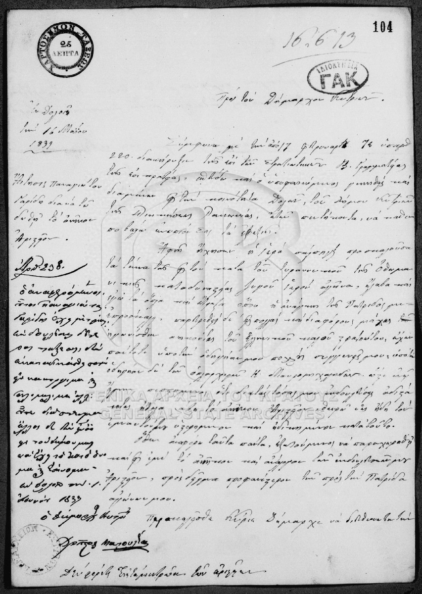 [Item] GRGSA-CSA_PAO007.00.01.F000059.IT000104 Item #104 - Aτομική αίτηση απονομής [16 Μαΐου 1839] Αίτηση απονομής Αριστείου του Παναγιώτη Γαρίδη προς τον Δήμαρχο Κυτριών. |