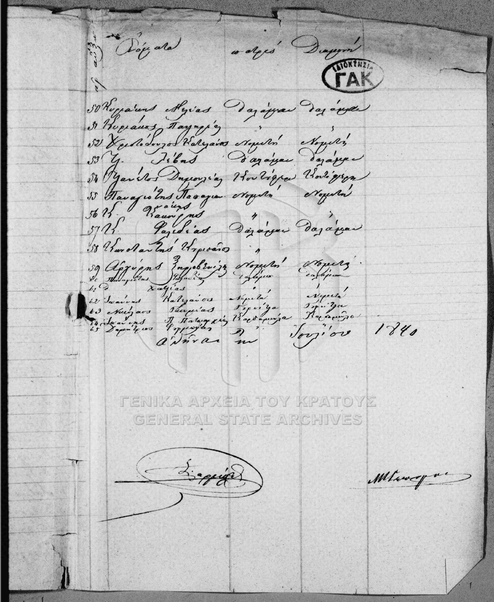 [Pièce] GRGSA-CSA_PAO007.00.01.F000059.IT000153 Pièce #153 - Ονομαστικοί κατάλογοι πολιτών αγωνιστών [Ιούλιος 1840] Ονομαστικοί κατάλογοι πολιτών αγωνιστών της Διοίκησης Λακωνίας. |
