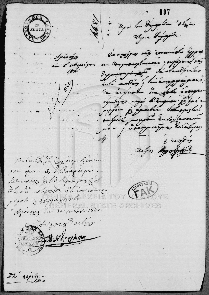 [Τεκμήριο] GRGSA-CSA_PAO007.00.01.F000066.IT000097 Τεκμήριο #097 - Aτομική αίτηση απονομής [6 Αυγούστου 1841] Αίτηση απονομής αριστείου του Πέτρου Κουφάκου προς τον δήμαρχο Οιτύλου. |