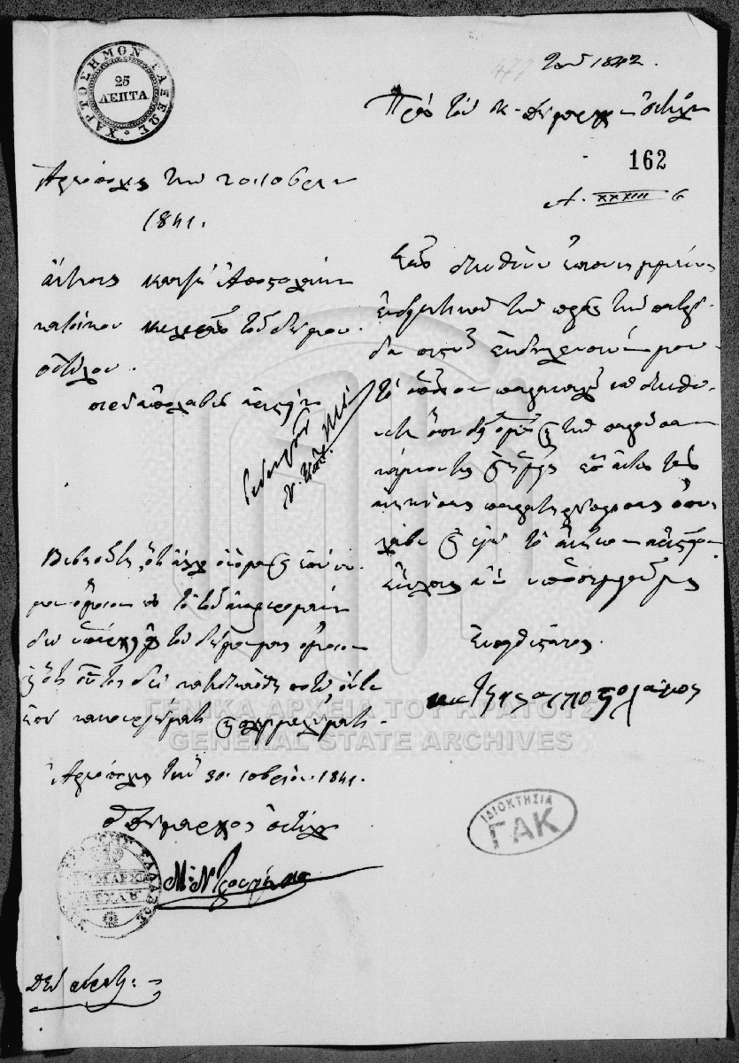 [Τεκμήριο] GRGSA-CSA_PAO007.00.01.F000066.IT000162 Τεκμήριο #162 - Aτομική αίτηση απονομής [20 Δεκεμβρίου 1841] Αίτηση απονομής αριστείου του Κατζή Αποστολάκου προς τον δήμαρχο Οιτύλου. |