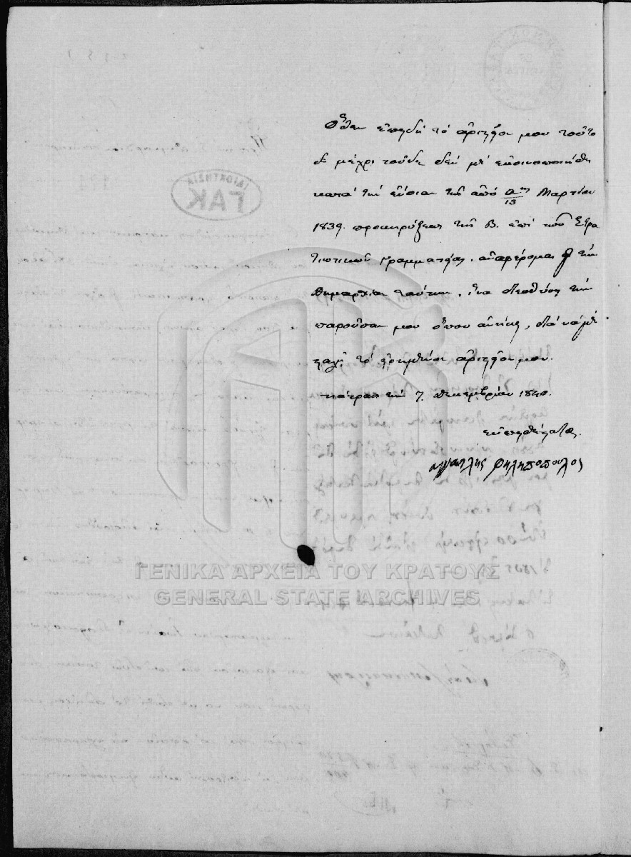 [Pièce] GRGSA-CSA_PAO007.00.01.F000067.IT000174 Pièce #174 - Aτομική αίτηση απονομής [7 Δεκεμβρίου 1840] Αίτηση απονομής αριστείου του Αγγελή Φιλιπόπουλου προς τον δήμαρχο Πατρών. |