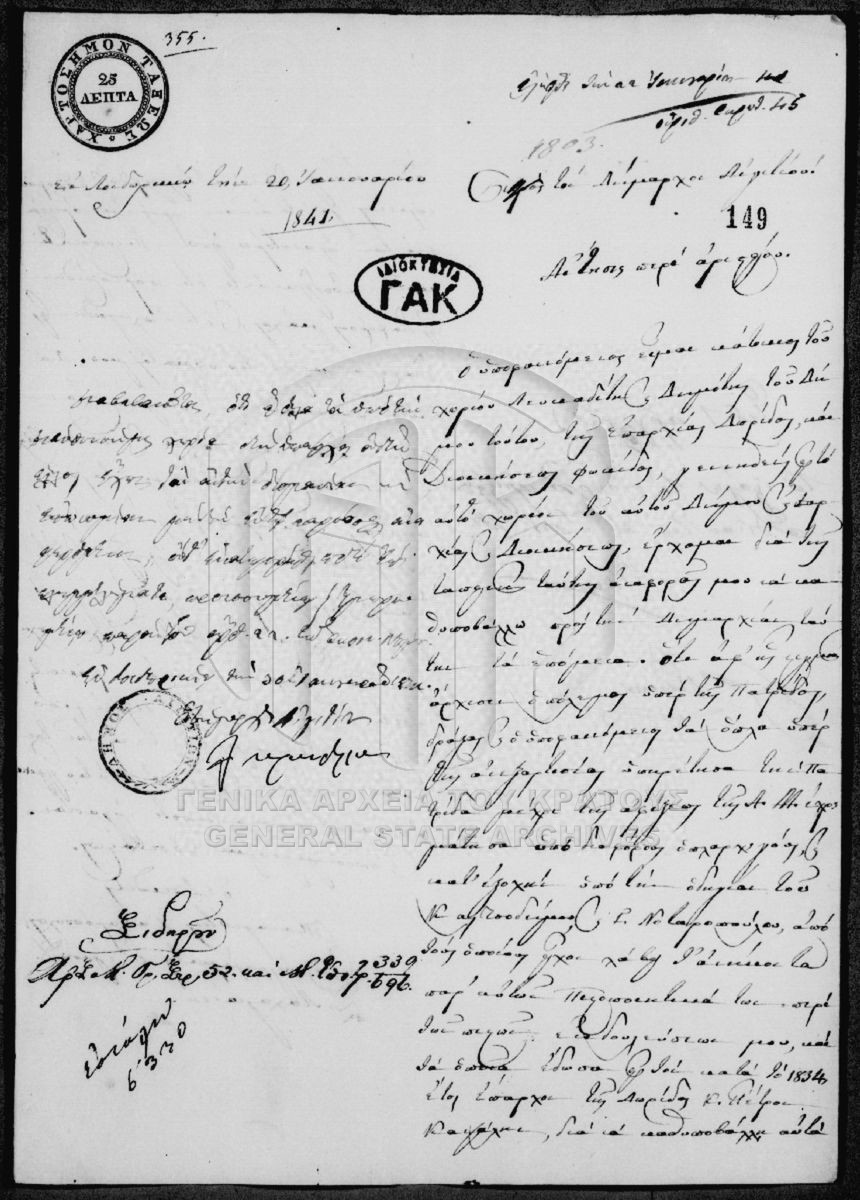 [Τεκμήριο] GRGSA-CSA_PAO007.00.01.F000068.IT000149 Τεκμήριο #149 - Aτομική αίτηση απονομής [20 Ιανουαρίου 1841] Επιστολή του Παναγιώτη Ζαχαρόπουλου προς το Δήμαρχο Αιγιτίου με την οποία ζητά την απονομή αριστείου για την προσφορά του στον Αγώνα της ... |