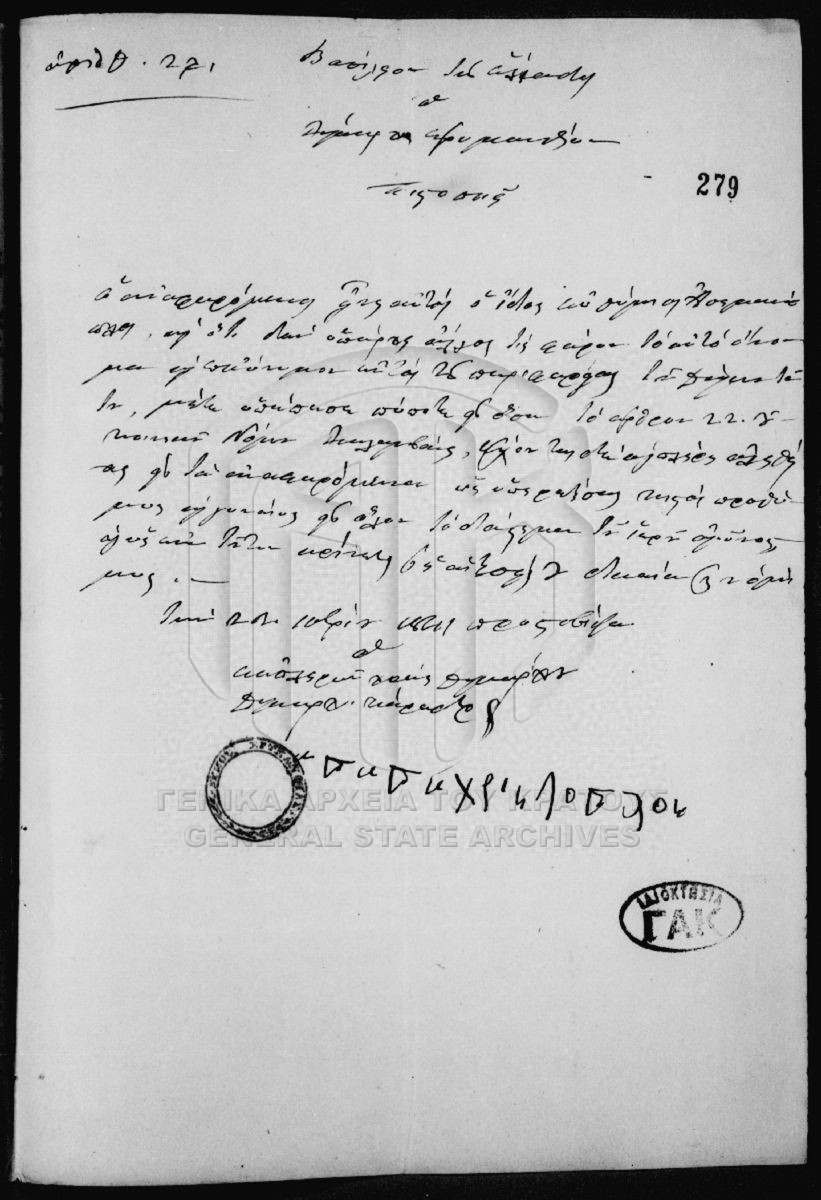 [Item] GRGSA-CSA_PAO007.00.01.F000061.IT000279 Item #279 - Πιστοποιητικό [22 Δεκεμβρίου 1841] Επιστολή του δημάρχου Ερυμανθίας με την οποία πιστοποιεί ότι ο Ευθύμιος Ασημακόπουλος συμμετείχε στον Αγώνα υπέρ της Ανεξαρτησίας. |