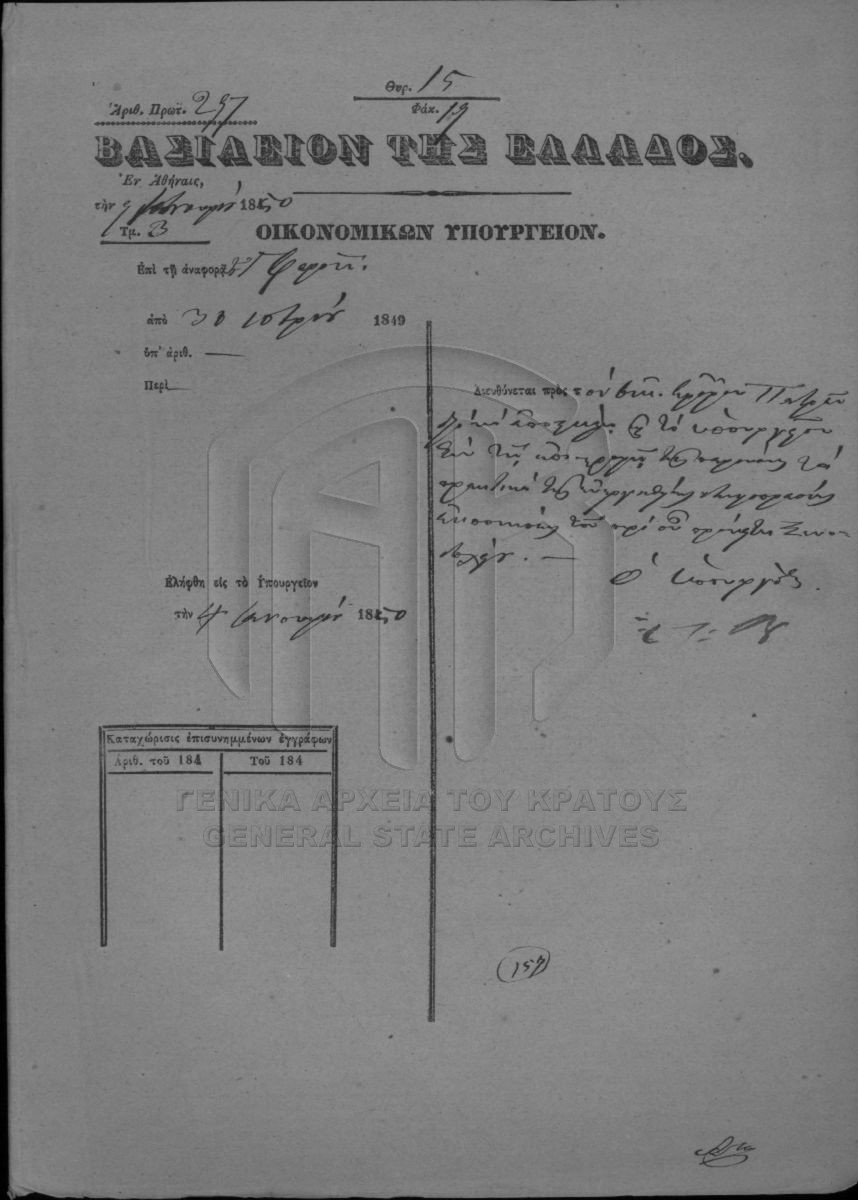 |  | [Αρχείο] GRGSA-CSA_PAO005.01 Αρχείο Εθνικών Κτημάτων [1833 - 1869] Το αρχειακό σύνολο «Εθνικά Κτήματα» αποτελεί τμήμα του αρχείου της Κεντρικής Υπηρεσίας του Υπουργείου Οικονομικών και περιλαμβάνει τεκμήρ... |