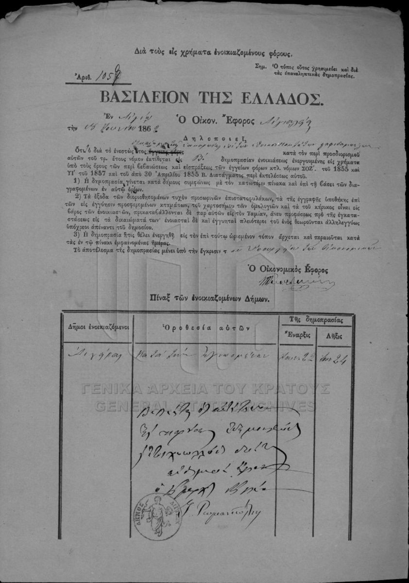 [Fonds] GRGSA-CSA_PAO005.01 SECRETARIAT/MINISTRY OF FINANCE ARCHIVE: NATIONAL LANDS (1833-1869) - SECRETARIAT/MINISTRY OF FINANCE ARCHIVE: NATIONAL LANDS (1833-1869) [1833 - 1869] Το αρχειακό σύνολο «Εθνικά Κτήματα» αποτελεί τμήμα του αρχείου της Κεντρικής Υπηρεσίας του Υπουργείου Οικονομικών και περιλαμβάνει τεκμήρ... |