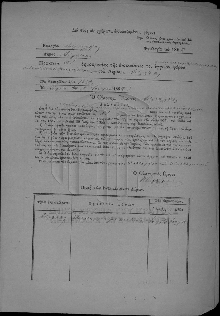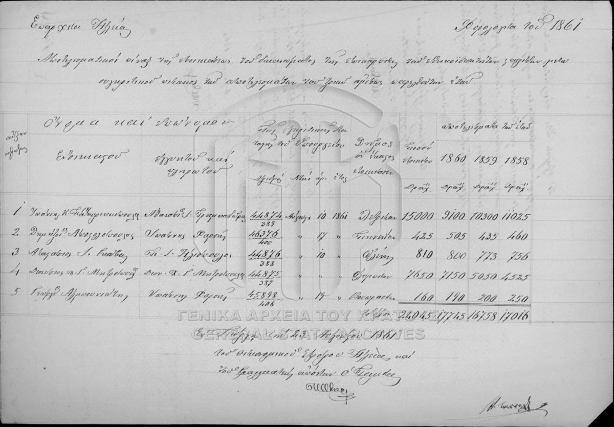 [File] GRGSA-CSA_PAO005.01.S06.SS05.F002162 File #2162 - SECRETARIAT/MINISTRY OF FINANCE ARCHIVE: NATIONAL LANDS (1833-1869) [1862] Multiannual and annual rentals of national perishable estates. Prefecture of Achaia and Ilida. |