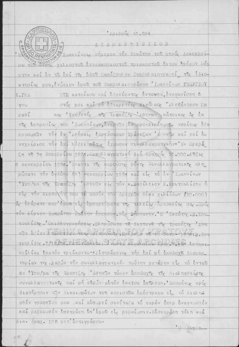 [Pièce] GRGSA-IAE_NOT001.01.F000043.IT010584 Pièce #10584 [10 Δεκεμβρίου 1936] Συμβολαιογραφική πράξη. Διαμαρτυρικό. |