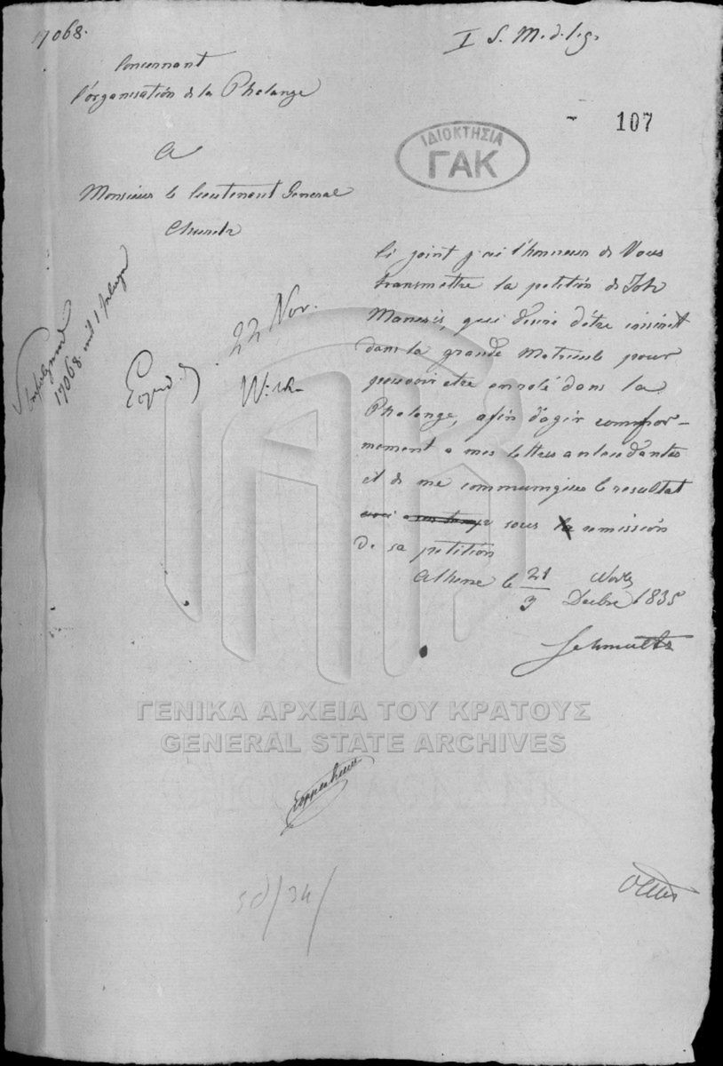 [Fonds] GRGSA-CSA_PAO007 Αρχείο Γραμματείας / Υπουργείου επί των Στρατιωτικών [1833 - 1862] Περιέχει φακέλους που έχουν προκύψει από τη διοικητική παραγωγή των τμημάτων Α΄ Προσωπικό – Οργάνωση, Β΄ Στρατιωτική νομοθεσία – Δικαιοσύ... |