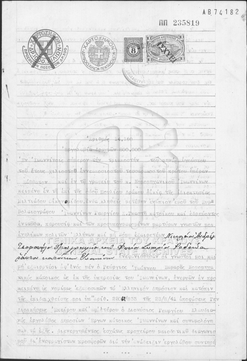 [Τεκμήριο] GRGSA-IAE_NOT001.01.F000056.IT014190 Τεκμήριο #14190 [30 Αυγούστου 1941] Συμβολαιογραφική πράξη. Εργολαβία. |