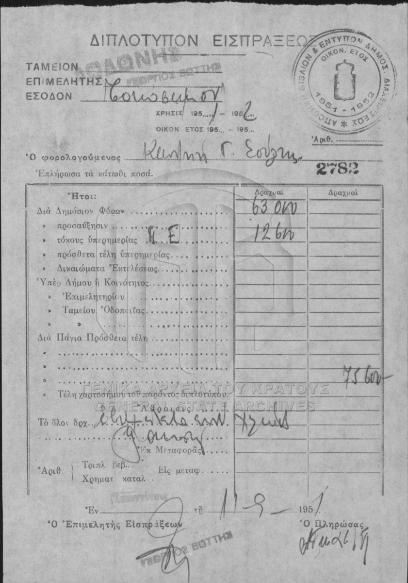 [Pièce] GRGSA-IAE_NOT001.01.F000086.IT020634 Pièce #20634 [10 Σεπτεμβρίου 1951] Συμβολαιογραφική πράξη. Εξόφληση κεφαλαίου και τόκων. |