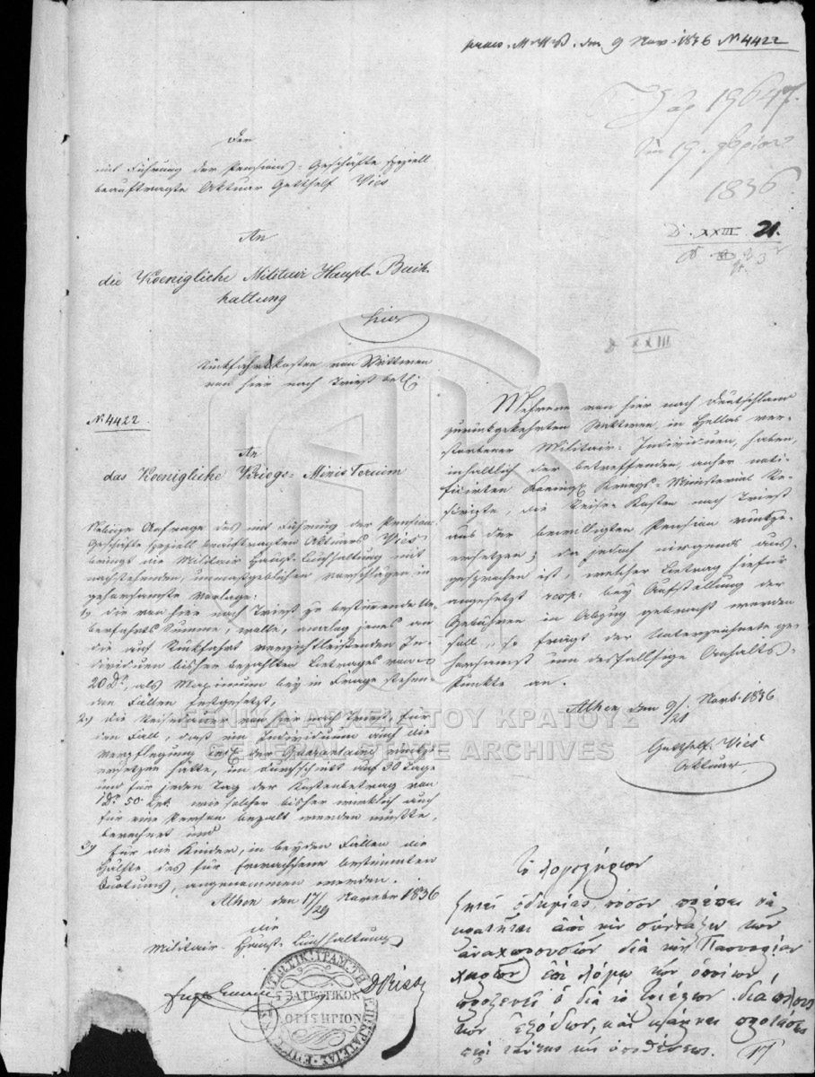 [Αρχείο] GRGSA-CSA_PAO007 Αρχείο Γραμματείας / Υπουργείου επί των Στρατιωτικών [1833 - 1862] Περιέχει φακέλους που έχουν προκύψει από τη διοικητική παραγωγή των τμημάτων Α΄ Προσωπικό – Οργάνωση, Β΄ Στρατιωτική νομοθεσία – Δικαιοσύ... |