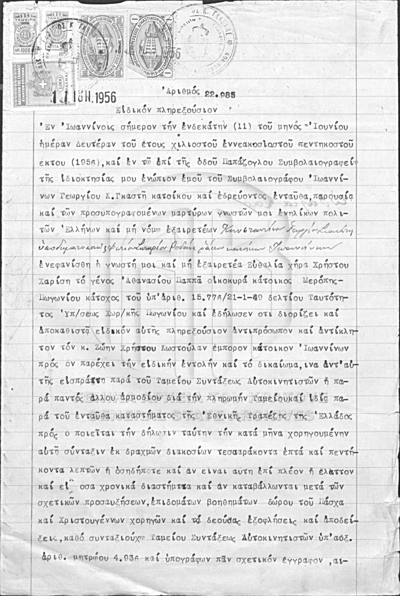 [Item] GRGSA-IAE_NOT001.01.F000097.IT022985 Item #22985 [11 Ιουνίου 1956] Notarial deed. Special power of attorney. |