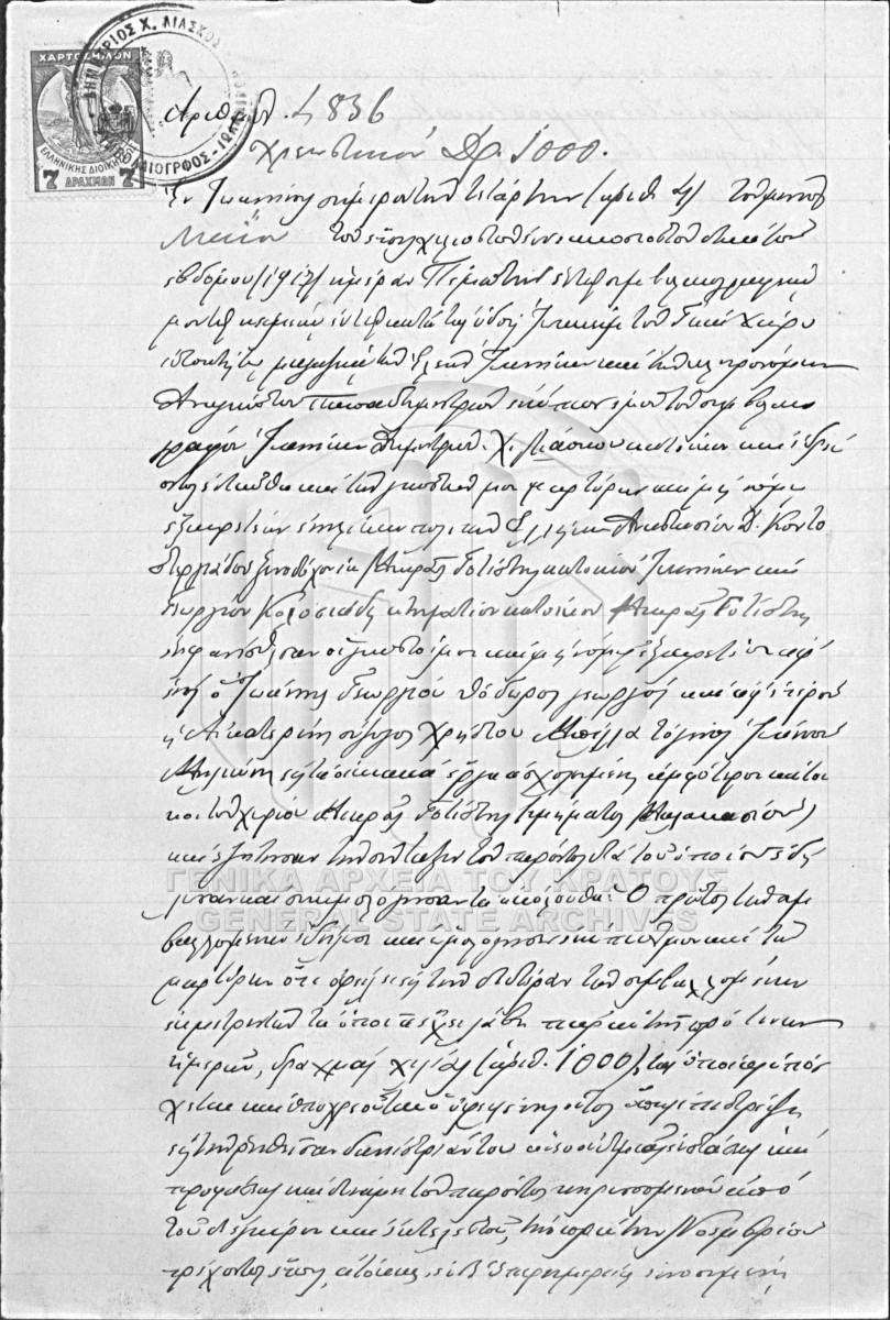 [Pièce] GRGSA-IAE_NOT002.01.F000012.IT004836 Pièce #4836 [4 Μαΐου 1917] Συμβολαιογραφική πράξη. Χρεωστικό. |