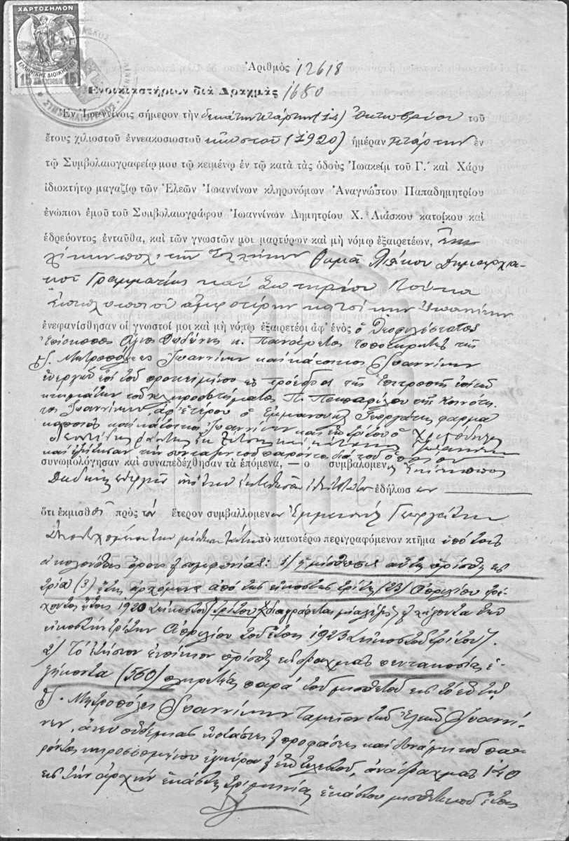 [Pièce] GRGSA-IAE_NOT002.01.F000029.IT012618 Pièce #12618 [14 Οκτωβρίου 1920] Συμβολαιογραφική πράξη. Ενοικιαστήριο. |