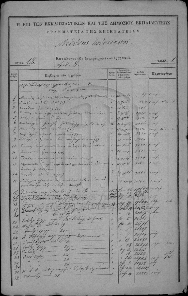 Το αρχείο της Γραμματείας επί των Εκκλησιαστικών και της Δημοσίου Εκπαιδεύσεως διαρθρώνεται σε τρεις σειρές ως εξής: Ι. Σειρά των Εκκλη...