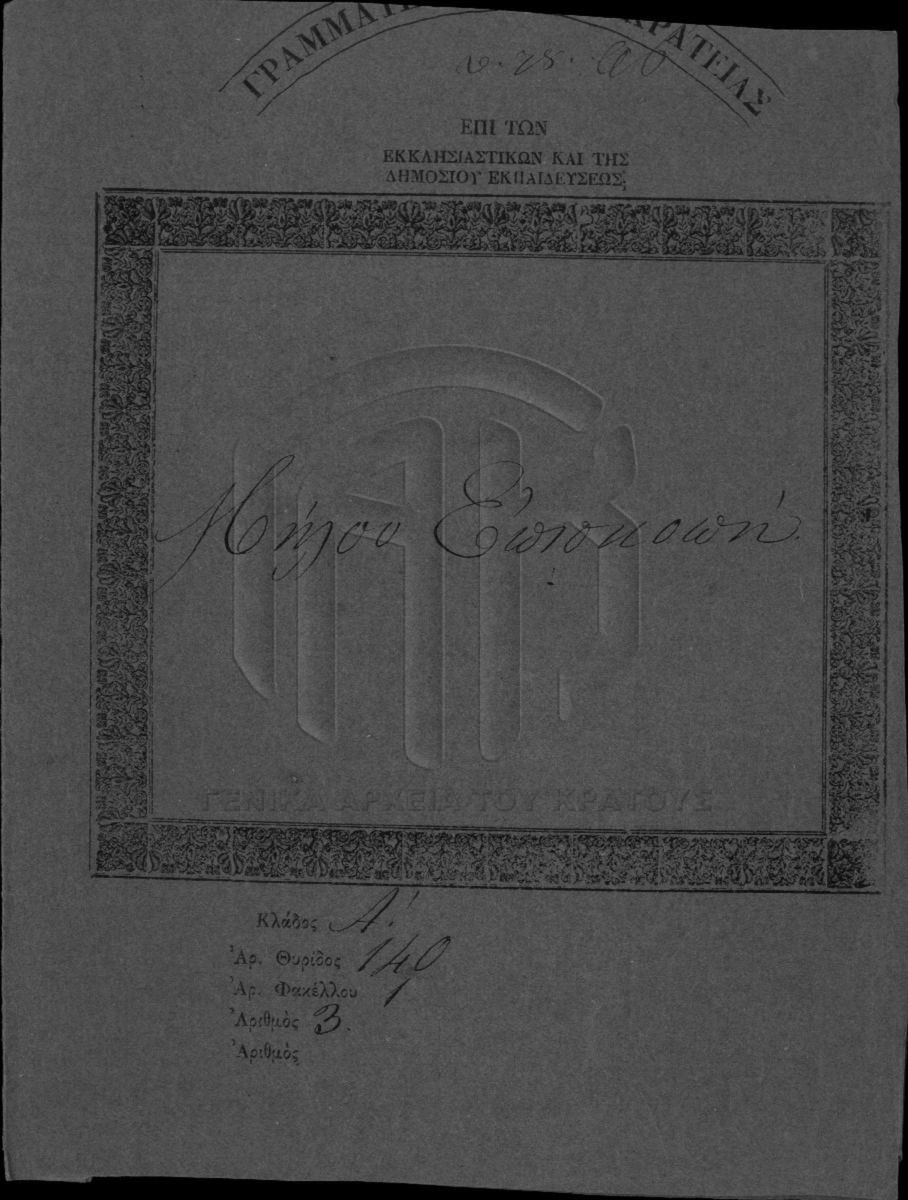 [Fonds] GRGSA-CSA_PAO013 SECRETARIAT/MINISTRY OF ECCLESIASTICAL ISSUES AND STATE EDUCATION ARCHIVE (1833-1848) - SECRETARIAT/MINISTRY OF ECCLESIASTICAL ISSUES AND STATE EDUCATION ARCHIVE (1833-1848) [1833 - 1848] Το αρχείο της Γραμματείας επί των Εκκλησιαστικών και της Δημοσίου Εκπαιδεύσεως διαρθρώνεται σε τρεις σειρές ως εξής: Ι. Σειρά των Εκκλη... |