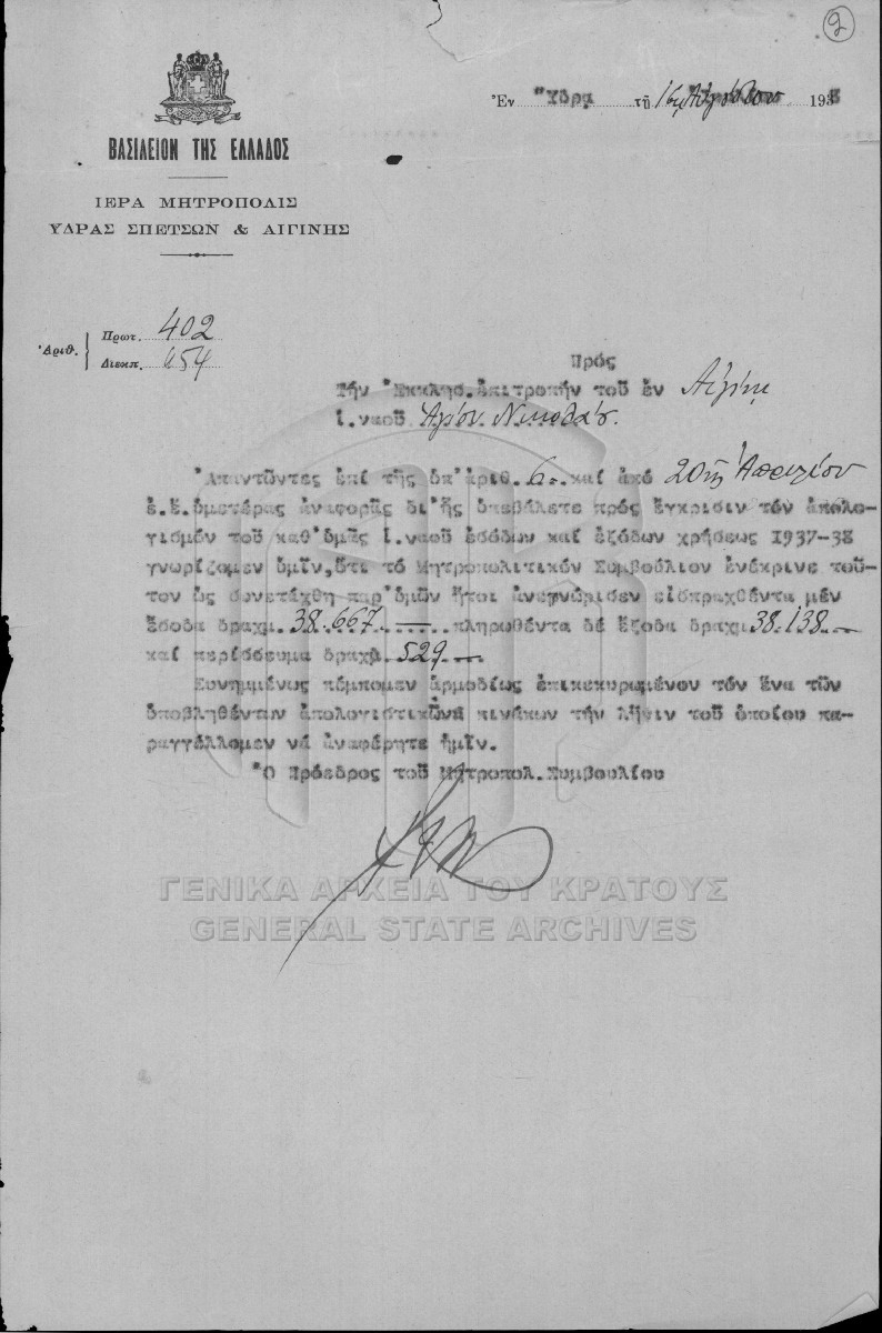 [Φάκελος] GRGSA-YDR_REL000.00.F000007 Φάκελος #007 [28/10/1936 - 3/8/1938] Πρακτικά Ι.Ν. Αγίου Νικολάου, Αίγινα. |